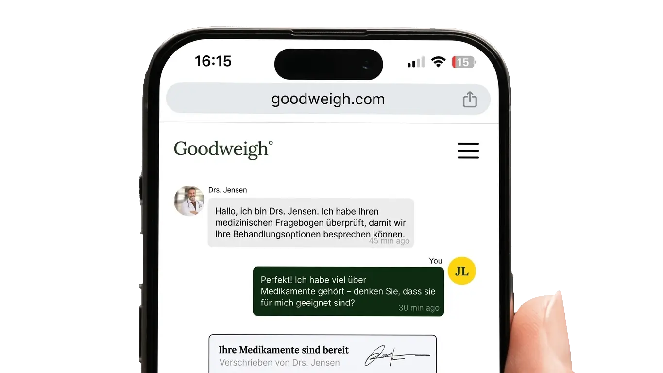Bei Goodweigh beginnen Sie mit einer Online-Aufnahme, bei der ein Arzt Ihren Gesundheitszustand beurteilt. Wenn das Abnehmspritze geeignet ist, erhalten Sie ein Rezept und das Abnehmspritze wird zu Ihnen nach Hause geliefert. Sie erhalten auch eine Anleitung, wie Sie die Behandlung wirksam und sicher gestalten können.